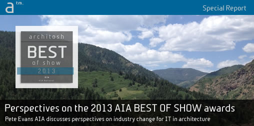 With continued focus on IPD and Integrated Practice reflecting formal process shifts, there are larger changes and additional relationships that the practice of architecture is shaping and being shaped by especially with the tools themselves. The Architosh 2013 AIA National BEST OF SHOW awards exemplify not only innovative tools and solutions, but clear recognition for platform openness from desktop to mobile–enabling a diverse ecosystem for building environments in the 21st century. This openness supports collaborations not possible before in this technology immersed profession and opens doors even beyond the social and cultural implications of architecture to even reposition the profession moving forward.