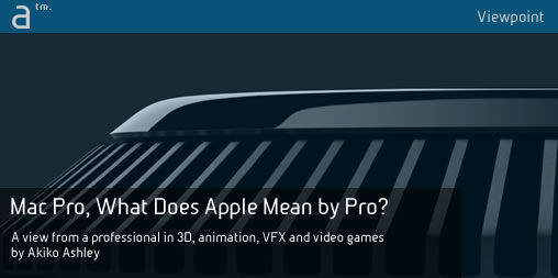 This Mac Pro is certainly a beautiful machine with a lot of power, a lot of professionals will certainly benefit from its superior specs from the previous model. What you have to ask yourself is…is this enough? Will Apple find a way to bring a larger market of professionals to the Mac Pro without alienating them by limiting the configuration of the Mac Pro out the gate? You can’t set a standard when you have limited market saturation. I love Apple and own all the mobile devices, an iMac and several Mac Pros for my home, but in the pipeline for my work…there isn’t one Mac. It can’t run Autodesk 3D Studio Max, Fume FX, or CUDA so I’m still waiting. I hope that in the future Apple will remedy this situation so that a Mac Pro can be found everywhere without any limitations. —- AKIKO ASHLEY