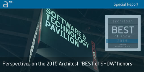 The purpose of the BEST of SHOW honors is to draw attention to the products and companies which have exhibited technology innovation and leadership within the Architectural market as measured by show interest, attendance, buzz, and a forward-looking analytic perspective developed by the editors of Architosh. This “perspective” is a constructed and developed lens through which technology in the architectural market is measured against both static and dynamic criteria with a particular single aim of clarifying, developing, enhancing and ensuring the social value of architects working worldwide in the 21st century.