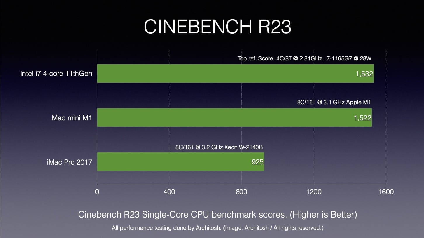And although we found excellent material online from Nuvia—the chip company started by Gerald Williams, Apple’s former chief CPU architect, about how well Geekbench 5 accurately simulates not just PC workloads but server CPU loads of a “comprehensive general nature”—even they state that an ideal benchmark is one “that is most representative of the customer’s workload.” Therefore, it is good to test against a range of most representative benchmarks. That is why we tested with GFXbench and Cinebench as well. In the latter, the M1 essentially tied a top reference score (Intel i7 11th Gen) 4-core machine. (see image here). When you get a moment read our two-part feature as it goes deep into the M1’s performance.