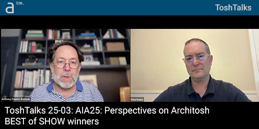 WELCOME TO ARCHITOSH’S third episode of its new ‘ToshTalks’ video series where we discuss AEC software and digital technologies. You can find the video below and on our new Architosh Official YouTube channel. We have a lot more planned for the channel, including instructional videos, videos essays from AEC and tech conferences, and specialized videos on foundational technologies and more.